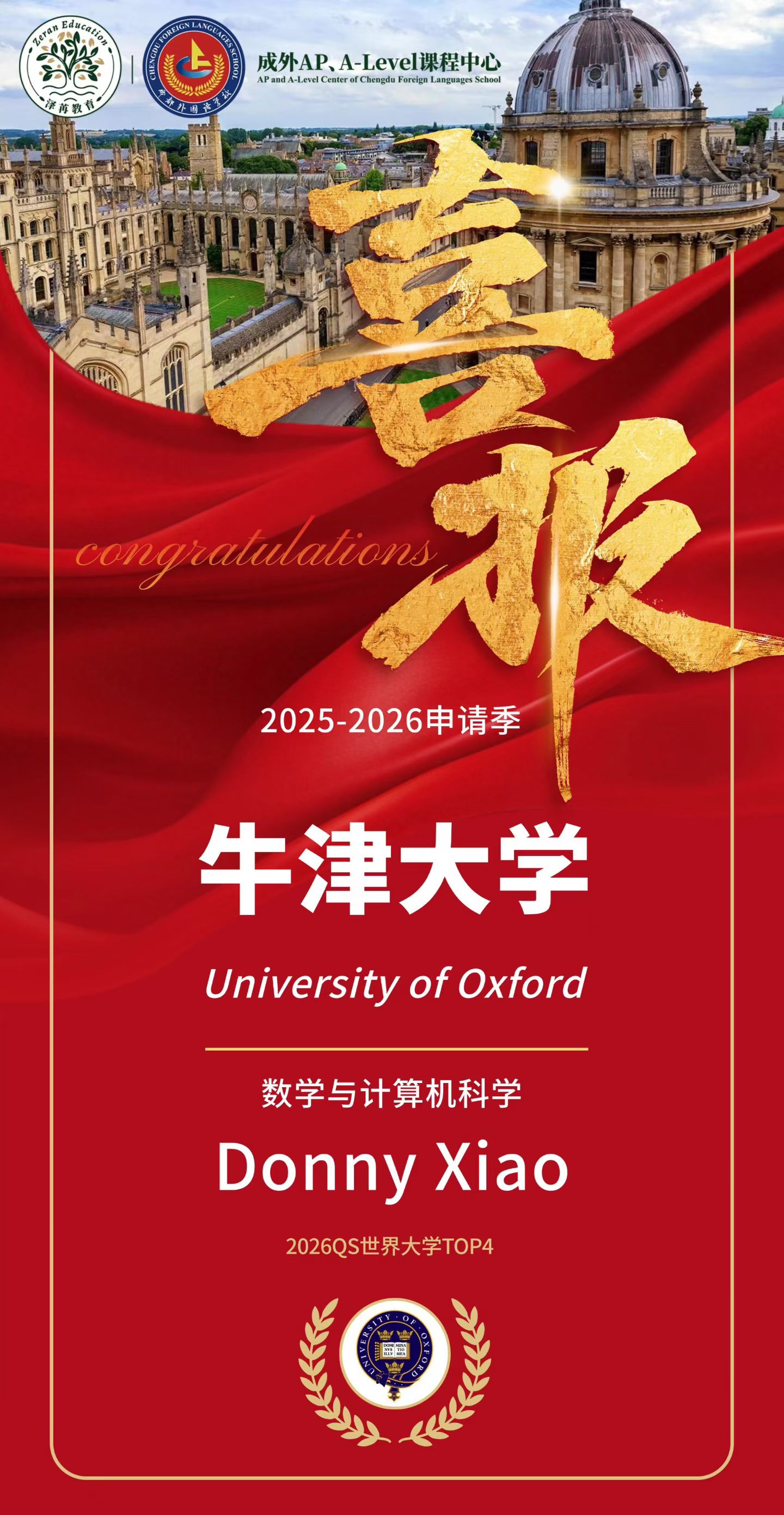 成都外国语学校(以下简称“成外”)AP、A-Level课程中心传来捷报,该校A-Level学子DonnyXiao成功斩获牛津大学数学与计算机科学专业预录取offer。据悉,该专业为牛津大学录取难度极高的王牌专业之一,标志着成外在顶尖名校顶尖专业申请领域实现又一重大突破,其顶尖名校录取持续呈现突破之势。