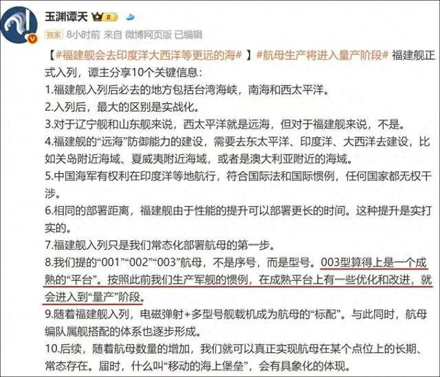 【官媒账号“玉渊谭天”披露中国航母之后的发展路径】